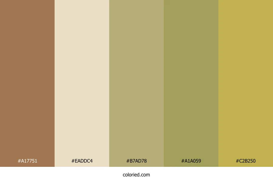 | #A1A059 | 161, 160, 89 | 59, 29%, 49% | 0%, 1%, 45%, 37% | oklch(0.691 0.093 108) | |