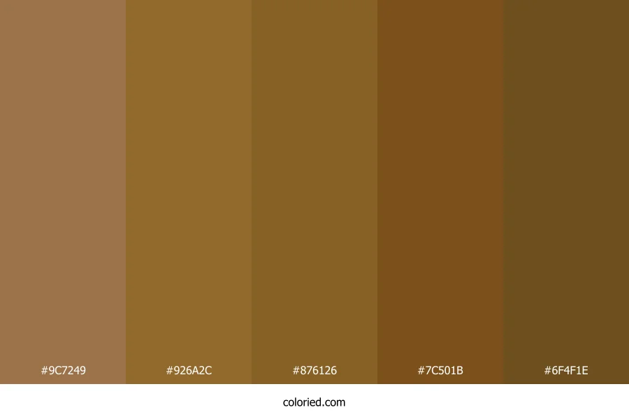 ![]() | #9C7249 | 156, 114, 73 | 30, 36%, 45% | 0%, 27%, 53%, 39% | oklch(0.585 0.078 65) |