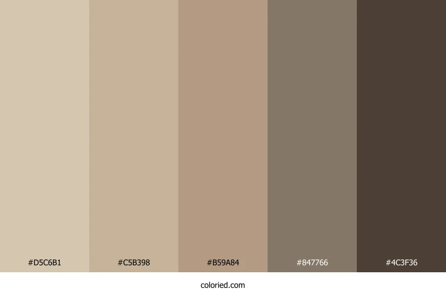 | #847766 | 132, 119, 102 | 34, 13%, 46% | 0%, 10%, 23%, 48% | oklch(0.576 0.030 75) | |