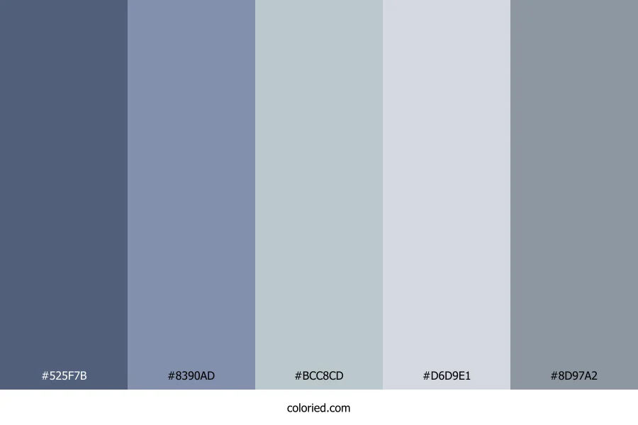 ![]() | #525F7B | 82, 95, 123 | 221, 20%, 40% | 33%, 23%, 0%, 52% | oklch(0.486 0.048 265) |
