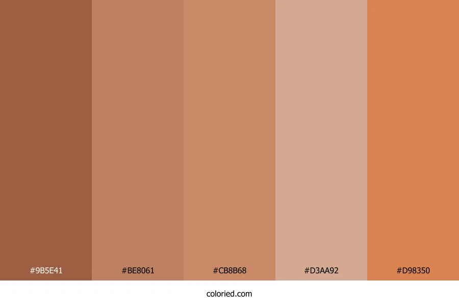 ![]() | #9B5E41 | 155, 94, 65 | 19, 41%, 43% | 0%, 39%, 58%, 39% | oklch(0.544 0.090 46) |