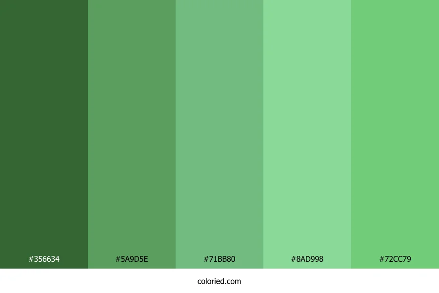 ![]() | #356634 | 53, 102, 52 | 119, 32%, 30% | 48%, 0%, 49%, 60% | oklch(0.462 0.095 143) |
