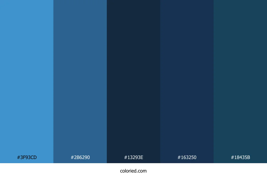| #13293E | 19, 41, 62 | 209, 53%, 16% | 69%, 34%, 0%, 76% | oklch(0.274 0.048 249) | |