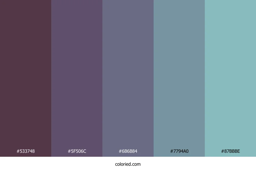 | #5F506C | 95, 80, 108 | 272, 15%, 37% | 12%, 26%, 0%, 58% | oklch(0.457 0.048 309) | |