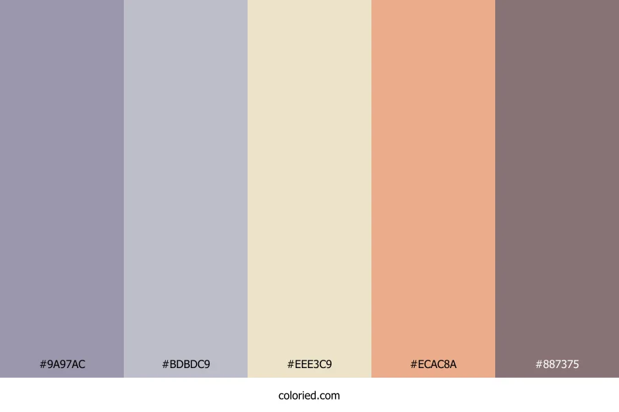 ![]() | #9A97AC | 154, 151, 172 | 249, 11%, 63% | 10%, 12%, 0%, 33% | oklch(0.686 0.031 292) |