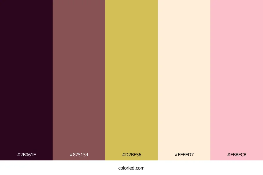 ![]() | #2B061F | 43, 6, 31 | 319, 76%, 10% | 0%, 86%, 28%, 83% | oklch(0.204 0.070 343) |