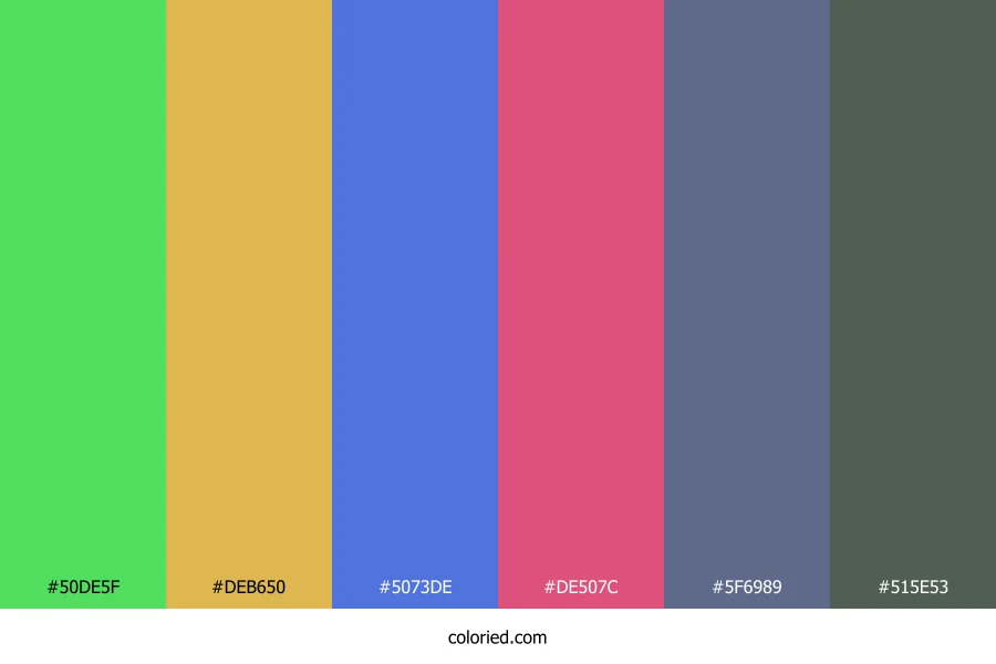 ![]() | #50DE5F | 80, 222, 95 | 126, 68%, 59% | 64%, 0%, 57%, 13% | oklch(0.797 0.208 145) |