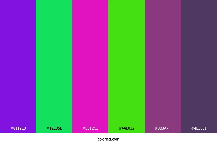 ![]() | #8112E0 | 129, 18, 224 | 272, 85%, 47% | 42%, 92%, 0%, 12% | oklch(0.507 0.262 300) |