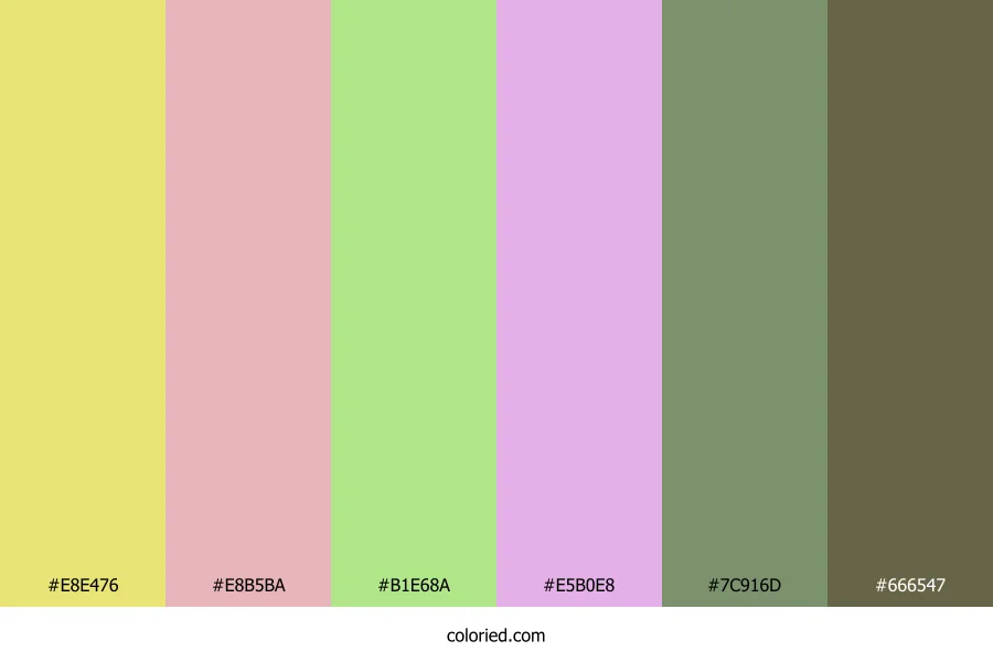 ![]() | #E8E476 | 232, 228, 118 | 58, 71%, 69% | 0%, 2%, 49%, 9% | oklch(0.900 0.133 107) |