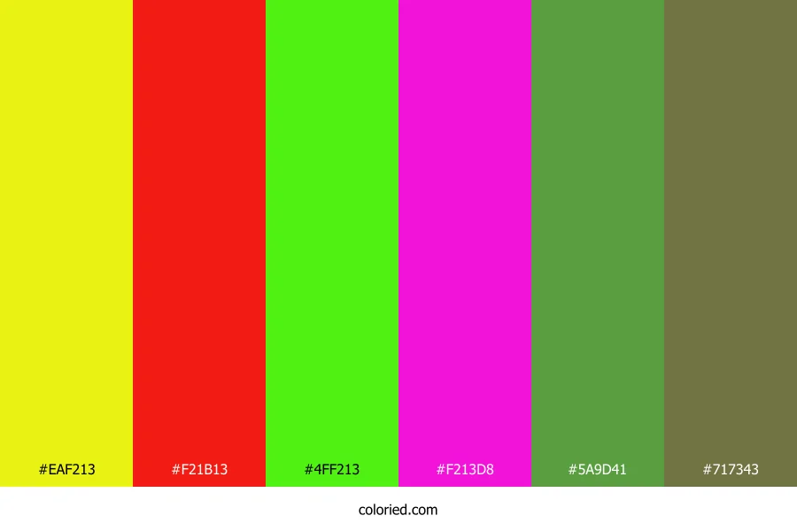 ![]() | #EAF213 | 234, 242, 19 | 62, 90%, 51% | 3%, 0%, 92%, 5% | oklch(0.924 0.202 112) |