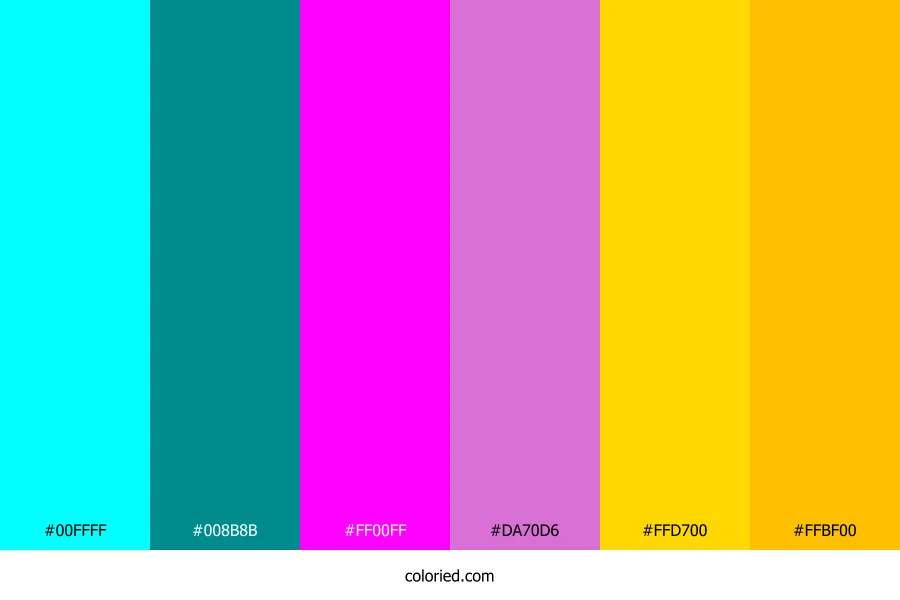 ![]() | #00FFFF | 0, 255, 255 | 180, 100%, 50% | 100%, 0%, 0%, 0% | oklch(0.905 0.155 195) |