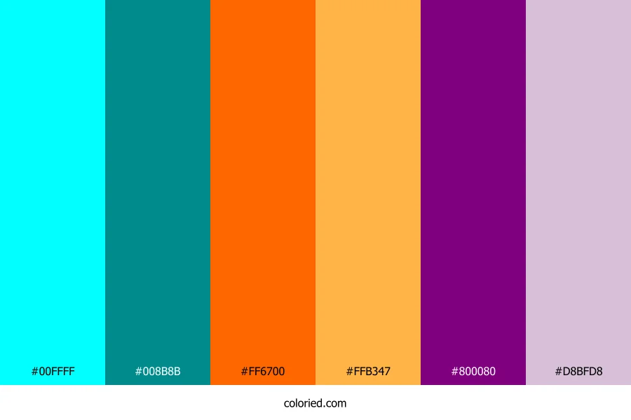 ![]() | #00FFFF | 0, 255, 255 | 180, 100%, 50% | 100%, 0%, 0%, 0% | oklch(0.905 0.155 195) |