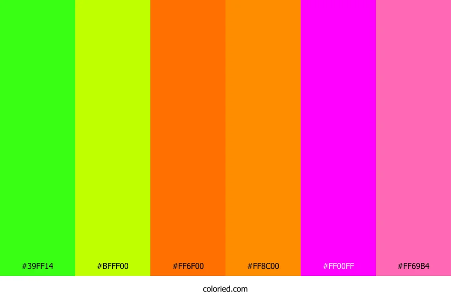 ![]() | #39FF14 | 57, 255, 20 | 111, 100%, 54% | 78%, 0%, 92%, 0% | oklch(0.871 0.286 142) |