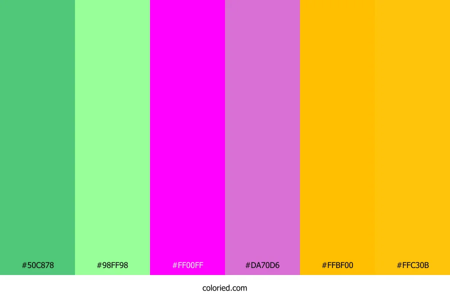 | #DA70D6 | 218, 112, 214 | 302, 59%, 65% | 0%, 49%, 2%, 15% | oklch(0.702 0.181 329) | |