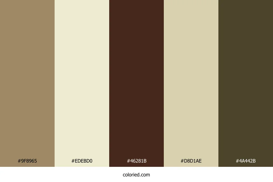 ![]() | #9F8965 | 159, 137, 101 | 37, 23%, 51% | 0%, 14%, 36%, 38% | oklch(0.641 0.057 80) |