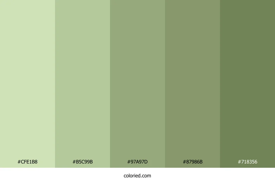 | #97A97D | 151, 169, 125 | 85, 20%, 58% | 11%, 0%, 26%, 34% | oklch(0.709 0.065 126) | |