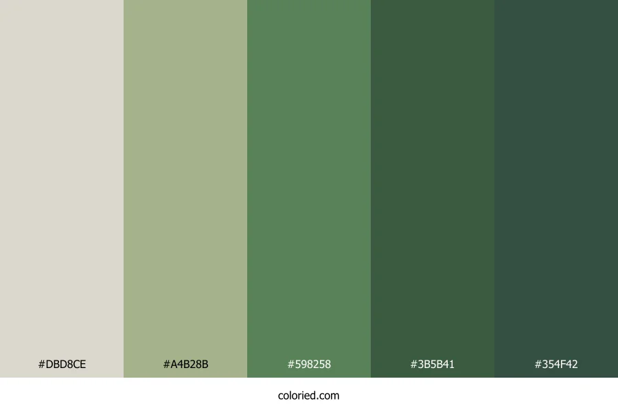 | #3B5B41 | 59, 91, 65 | 131, 21%, 29% | 35%, 0%, 29%, 64% | oklch(0.438 0.057 150) | |