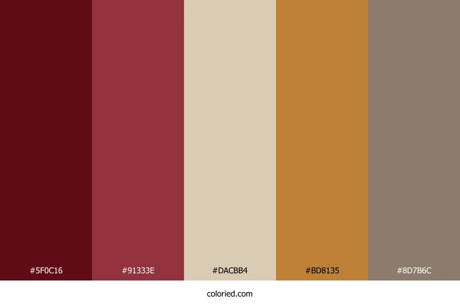 ![]() | #5F0C16 | 95, 12, 22 | 353, 78%, 21% | 0%, 87%, 77%, 63% | oklch(0.316 0.114 21) |