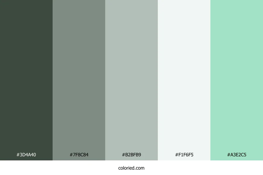 | #B2BFB9 | 178, 191, 185 | 152, 9%, 72% | 7%, 0%, 3%, 25% | oklch(0.793 0.017 167) | |