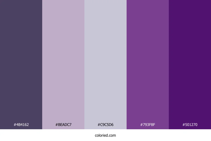 ![]() | #4B4162 | 75, 65, 98 | 258, 20%, 32% | 23%, 34%, 0%, 62% | oklch(0.400 0.056 298) |